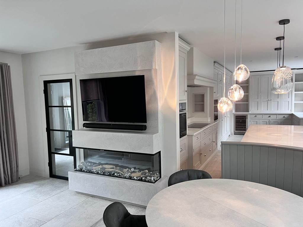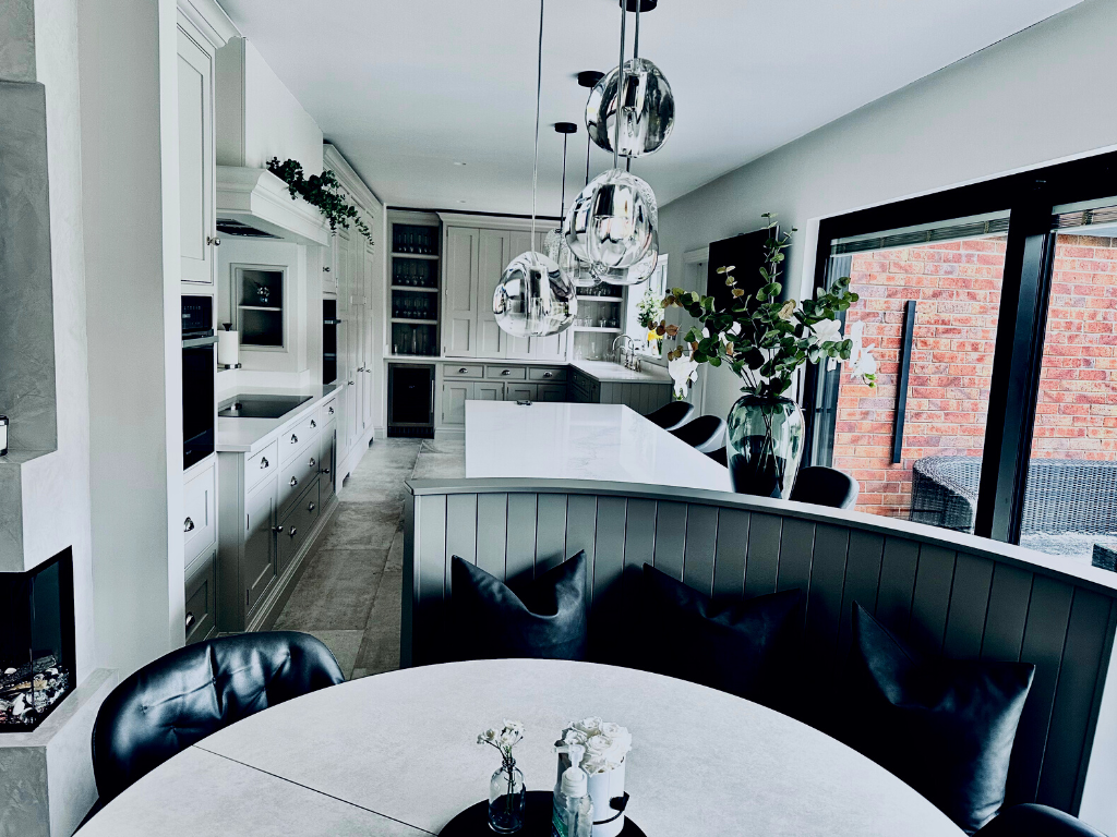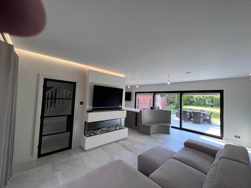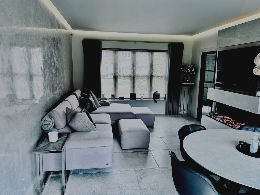 Tony really helped transform their 1990s newbuild into something extra-special, which really stands out amongst neighbouring homes. Features like white porcelain interior and exterior floor tiles, picture patio doors leading seamlessly out from what is now a stunning open plan kitchen living space into the newly landscaped garden, have contributed to a space these clients and their family just can’t resist spending time in. And then there is their cosy new living room with L-shaped sofa and built-in media wall, set off by rare Venetian plastering, all of which started as visions inside Tony’s mind and really captured the imagination of the clients.